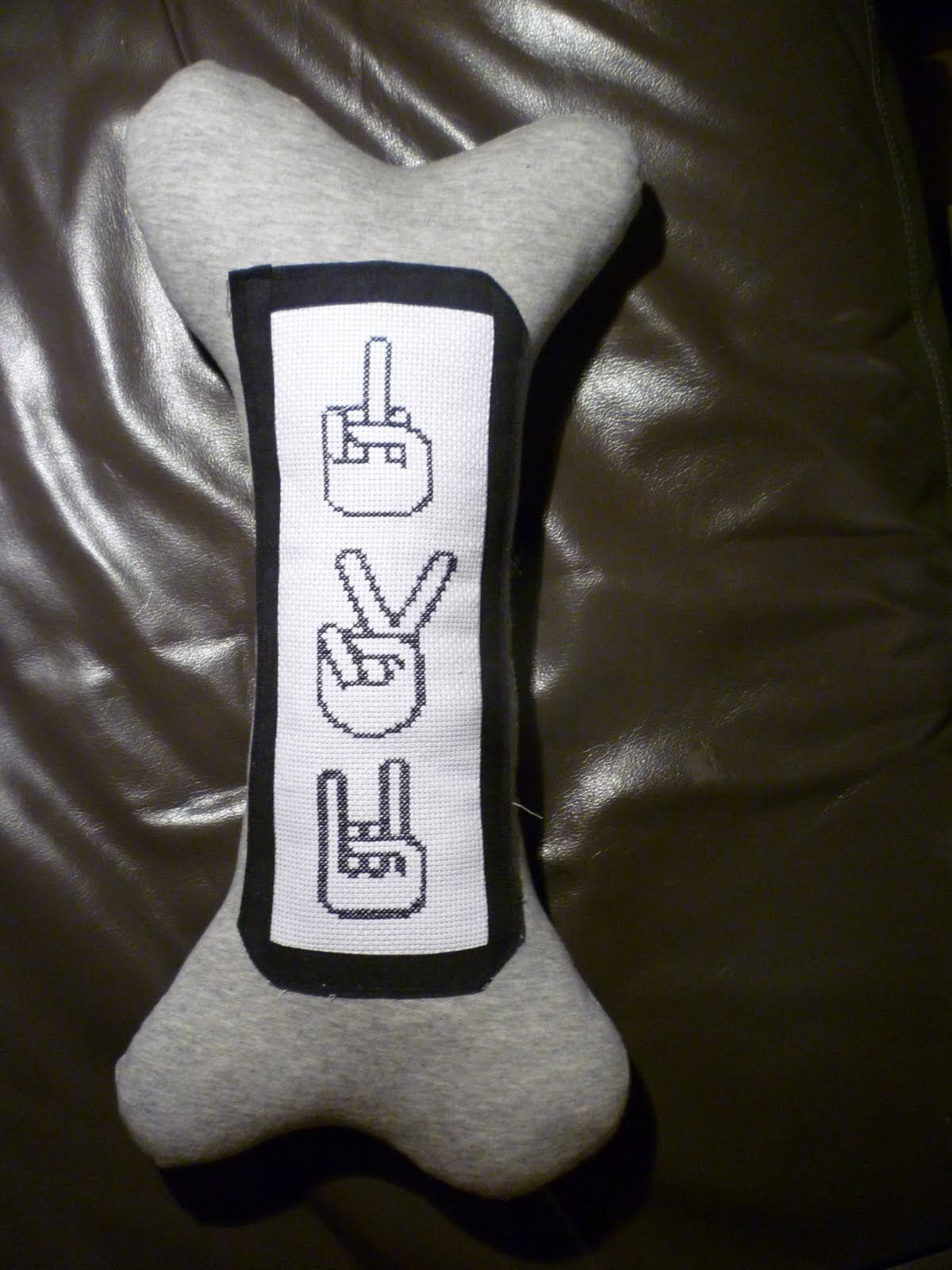 Ovviamente non potevo non piazzare almeno un punto croce in questo post ;P. E’ quindi con grande orgoglio che vi mostro la t-shirt che mi hanno regalato dopo aver visto il cuscino a forma di osso con le manine ricamate(vedi video e preparati per il tormentone dell’estate) che ho fatto per loro: orgogliona orgogliona orgogliona!